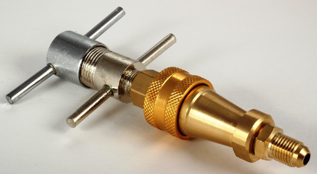 На другом конце муфты расположено резьбовое соединение для подключения сервисного шланга вакуум заправочной станции. Для установки муфты необходимо немного раскрутить ее резьбовое соединение, затем вставить заправочник (медная трубка 6 мм) отверстие муфты, где расположены шайбы из металла и прокладка из резины.